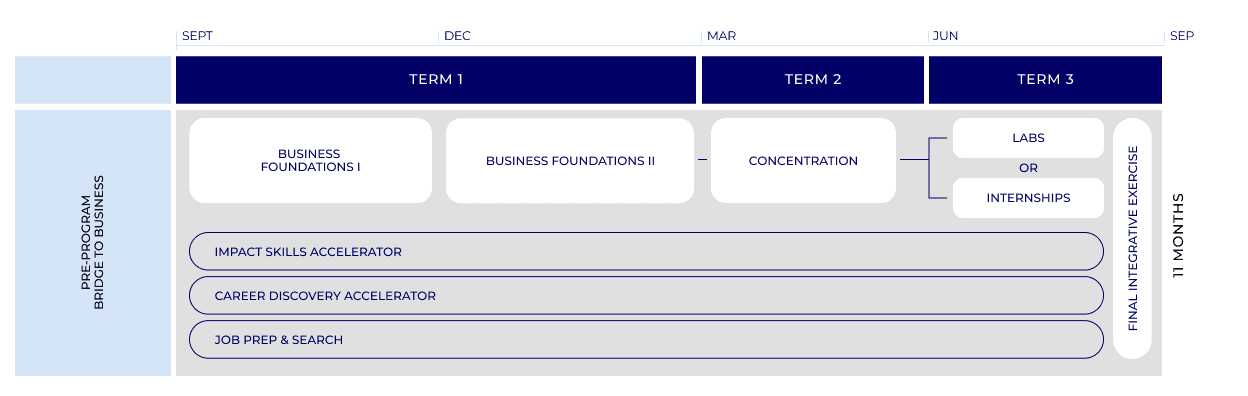 戦略、財務、会計、オペレーション、マーケティング、経済学、イノベーション、起業家精神など、ビジネスにおける中核となる基礎的な科目をすべて扱います。ケースメソッドはもちろん、講義やツールを使った授業など様々な形式で効果的に学びます。15週間の集中講義は2つのサブ講義に分かれ、それぞれ7~8週間実施されます。