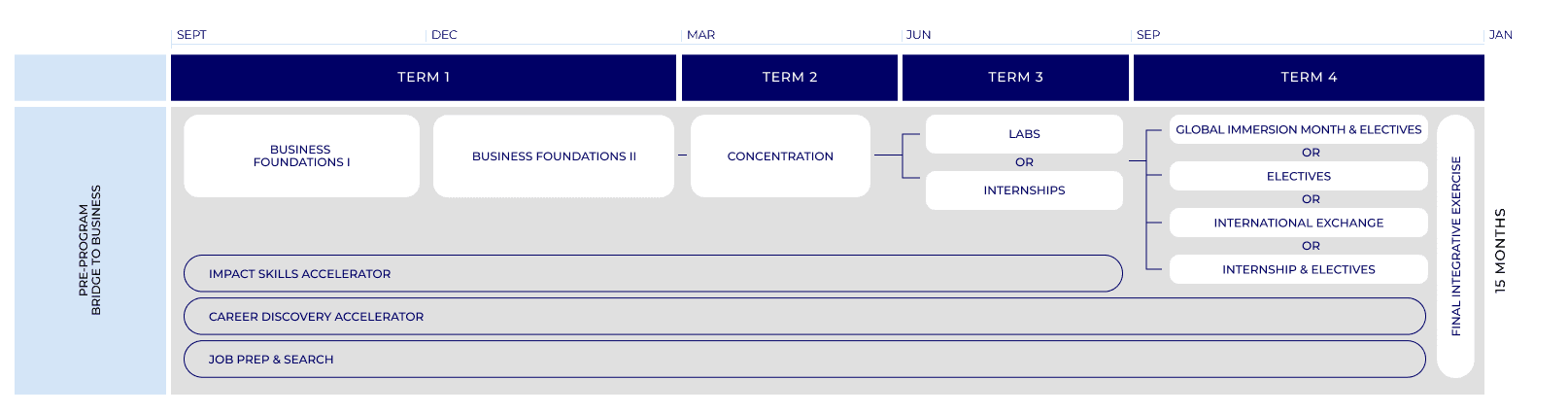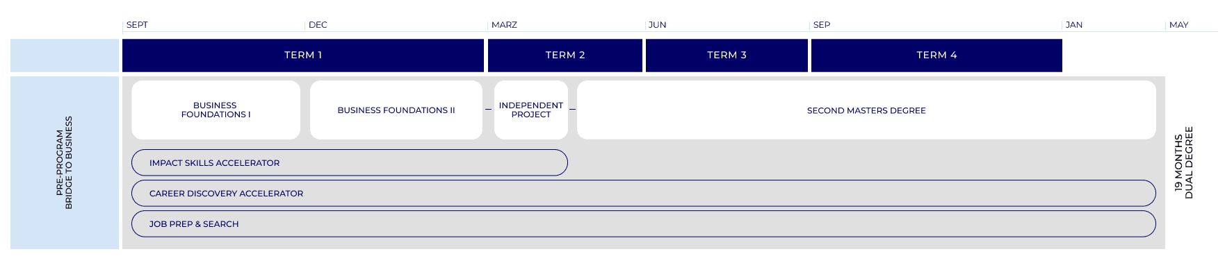 11か月、15か月、Dual Degreeで専門性を高める19 or 23か月から期間を選択。